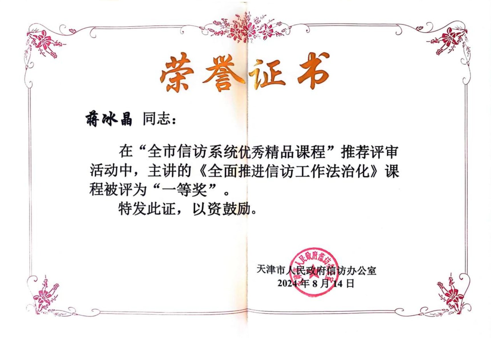 蜜桃视频 蒋冰晶教授在天津市的“全市信访系统优秀精品课程”推荐评审活动中,主讲的《全面推进信访工作法治化》课程被评为“一等奖”。