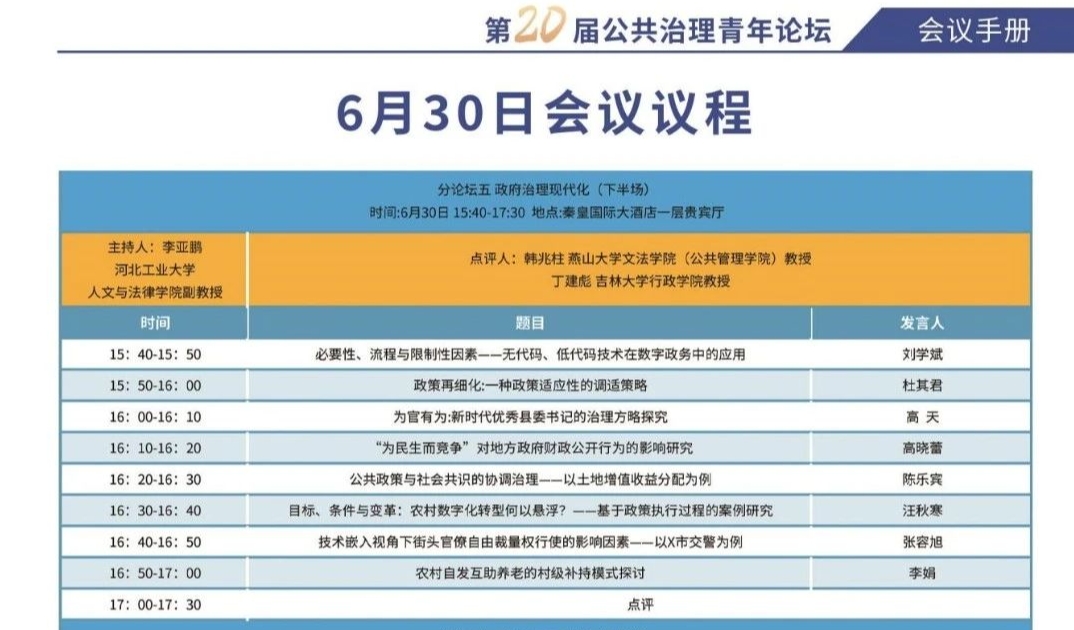 2024年6月28日至6月30日,“第二十届公共治理青年论坛”在河北秦皇岛成功举办。“公共治理青年论坛”是由国内公共治理领域青年学者联合发起和组织的系列会议,旨在推动青年学者研讨当代中国公共治理转型过程中的重大理论和实践问题,自2014年以来已连续举办至第20届,已有数千名学者参与了论坛的研讨交流。