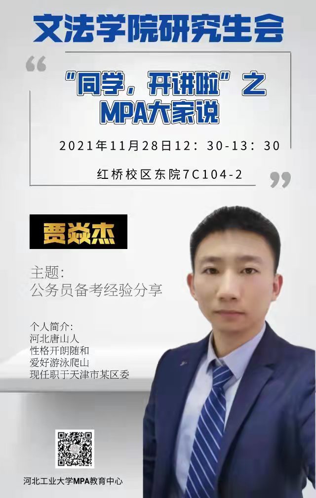2021年11月28日中午12:30,文法学院研究生会MPA大家说第一期,在红桥校区7C104-2顺利举行。本期主讲嘉宾的是MPA212班的贾焱杰同学。活动伊始,MPA中心招生总监张明展老师介绍了MPA大家说的策划缘由、活动目标及未来规划,希望本系列活动能为同学们提供一个新平台,帮助大家互动交流,了解各行各业,提升自我。