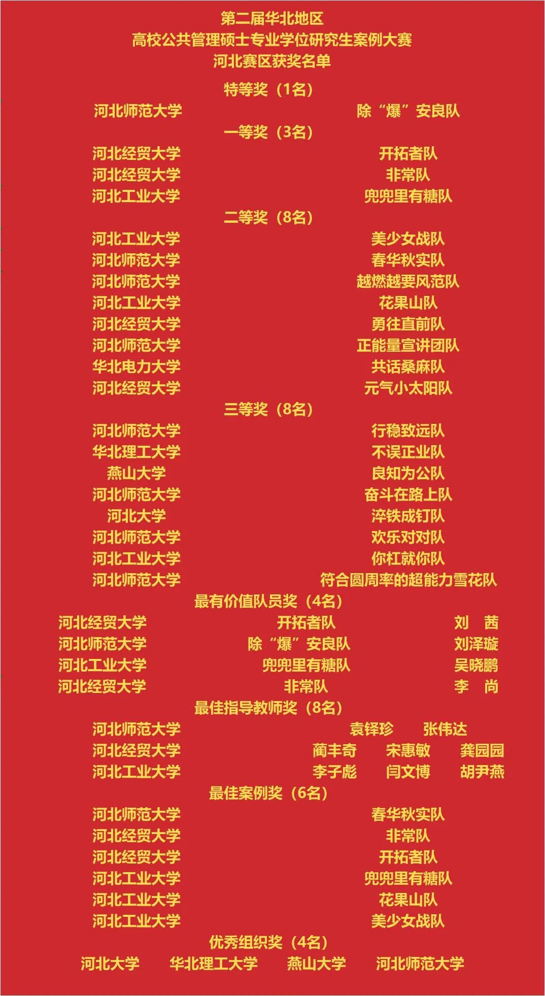 2022年9月25日,第二届华北地区高校公共管理硕士专业学位研究生(MPA)案例大赛河北赛区预选赛决赛在天津举行。来自7家MPA培养单位的46支队伍经过激烈角逐,最终河北师范大学代表队荣获特等奖,蜜桃视频 、河北经贸大学等3支代表队获一等奖,蜜桃视频 等8支队伍获二等奖;河北大学等8支队伍获三等奖。大赛前11名获奖队将代表河北省参赛。