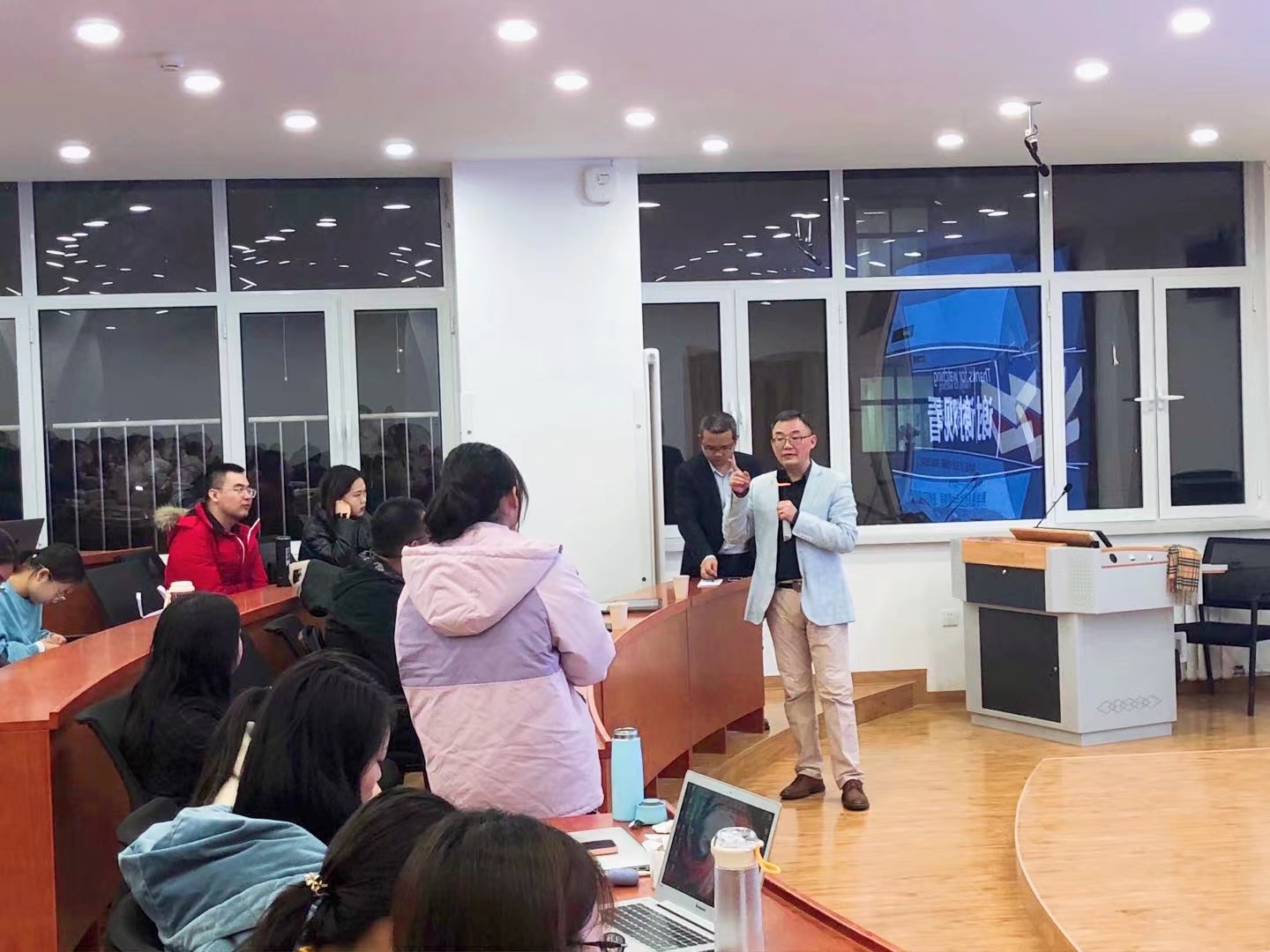 讲座尾声,同学们针对本次讲座提出了自己的疑惑,胡校长进行了精彩的解答;闫文博副院长总结了此次讲座的收获,并对胡校长的到来表示了由衷的感谢,闫文博副院长指出本次讲座对于文科学生的学习和研究有着很重要的意义,希望同学们在学好人文社科知识的基础上可以再去了解一些自然科学知识,提升能力,拓宽眼界。最后,在同学们热烈的掌声中本次讲座圆满结束。