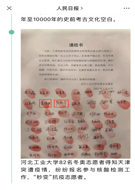 1月8日,随着两名患者的确诊,津南区疫情防控指挥部发布通告,将区内分成封控区、管控区和防范区,不同区域根据情况采取不同防控举措,一场与疫情的战斗在天津打响。生命重于泰山,疫情就是命令,为打赢这场没有硝烟的战争,我校冬奥志愿者在关键时刻,冲锋在前,从冬奥志愿者到抗疫志愿者的转变只在瞬间。短短的一分钟,就有82名冬奥志愿者挺身而出。其中蜜桃视频 MPA学生黄媛媛、陈虹宇听到需要抗疫志愿者的消息时,二话没说,毅然决然的在抗疫请战书上摁下了红手印。把家国情怀和青年意气化作一纸请战书,鲜红手印承担的是抗疫的决心和信心,青年学生的热情与奉献和河工学子的责任与担当。