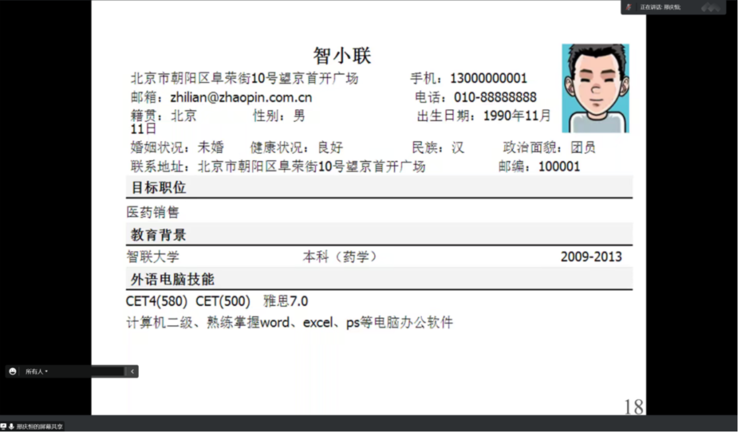 邢老师从一份简历所包含的因素讲起,首先讲了个人简历中的个人信息部分,随后详细地讲解了政治面貌和籍贯如何填写。