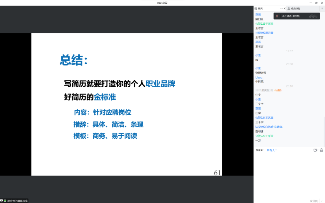 最后,邢老师给出了本次讲座的总结,好简历的金标准有三条:内容应针对应聘岗位;措辞需具体、简洁,条理;模板应是商务且易于阅读的。