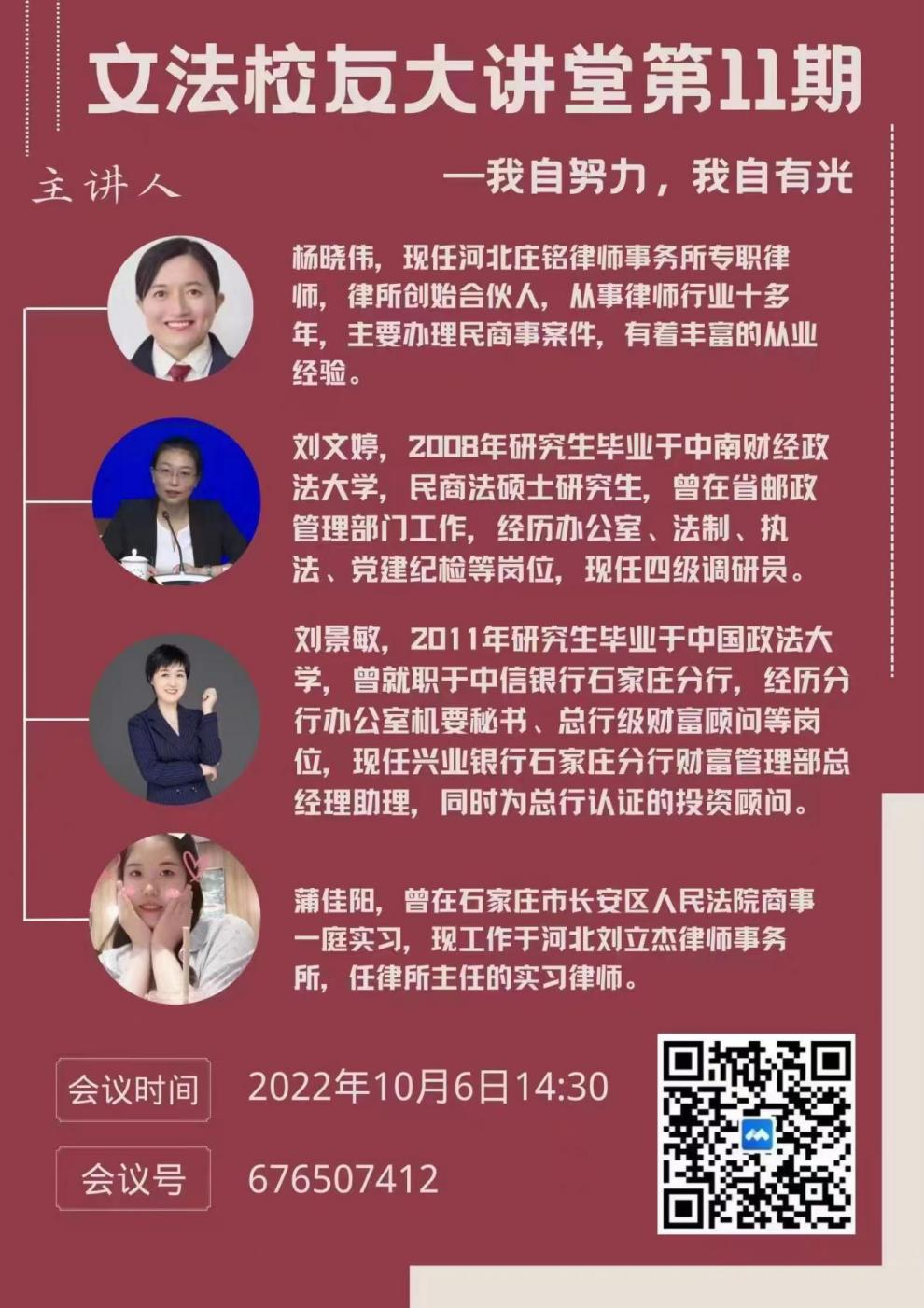 10月6日下午2点半,蜜桃视频 法学系举办了题为“我自努力,我自有光”的线上讲座。本次讲座的主讲人为石家庄校友杨晓伟、刘景敏、蒲佳阳、刘保泰和张严冰。马立民副院长、蒋冰晶、王海龙等老师也参加了本次讲座。五位校友根据自己的经历与各位老师、同学分享多年来的工作生活经验与心得。