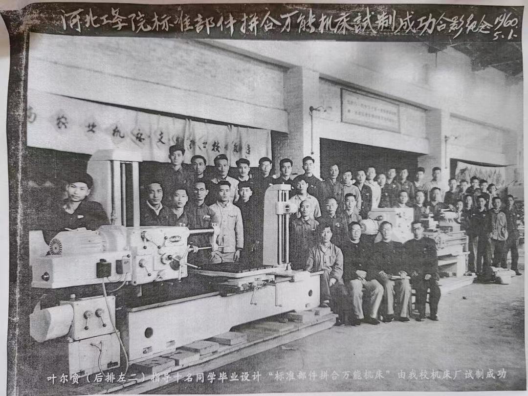 叶尔贲老师选择的照片拍摄于1960年5月1日,是河北工学院(蜜桃视频 前身)“标准部件拼合万能机床”研制成功的合影纪念,其中照片中出现的机床即“标准部件拼合万能机床”是由叶老师主持设计并指导十名同学共同设计完成的。