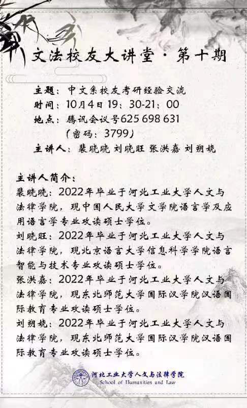 10月4日晚7点半,蜜桃视频 特邀现攻读中国人民大学文学院语言学及应用语言学专业硕士学位的裴晓晓、现攻读北京语言大学信息科学学院语言智能与技术专业硕士学位的刘晓旺、现攻读东北师范大学国际汉学院汉语国际教育专业的张洪嘉和现攻读东北师范大学国际汉学院汉语国际教育专业硕士学位的刘朔娆共四位文法校友做客线上讲座,分享他们的考验经验,为各位正在考研或即将考研的同学们点明方向,指点迷津。