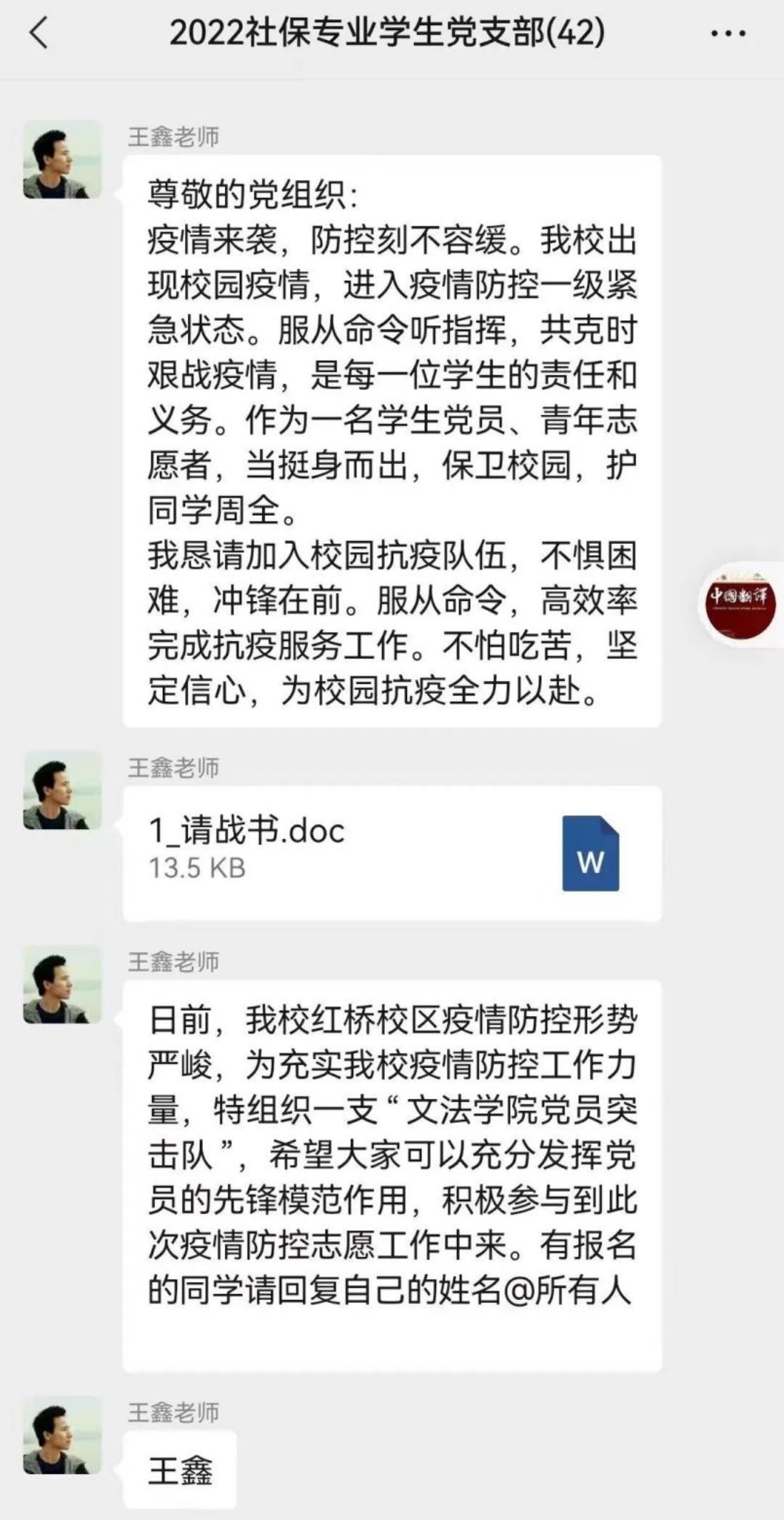 文法学院组建党员志愿者突击队和青年志愿者突击队