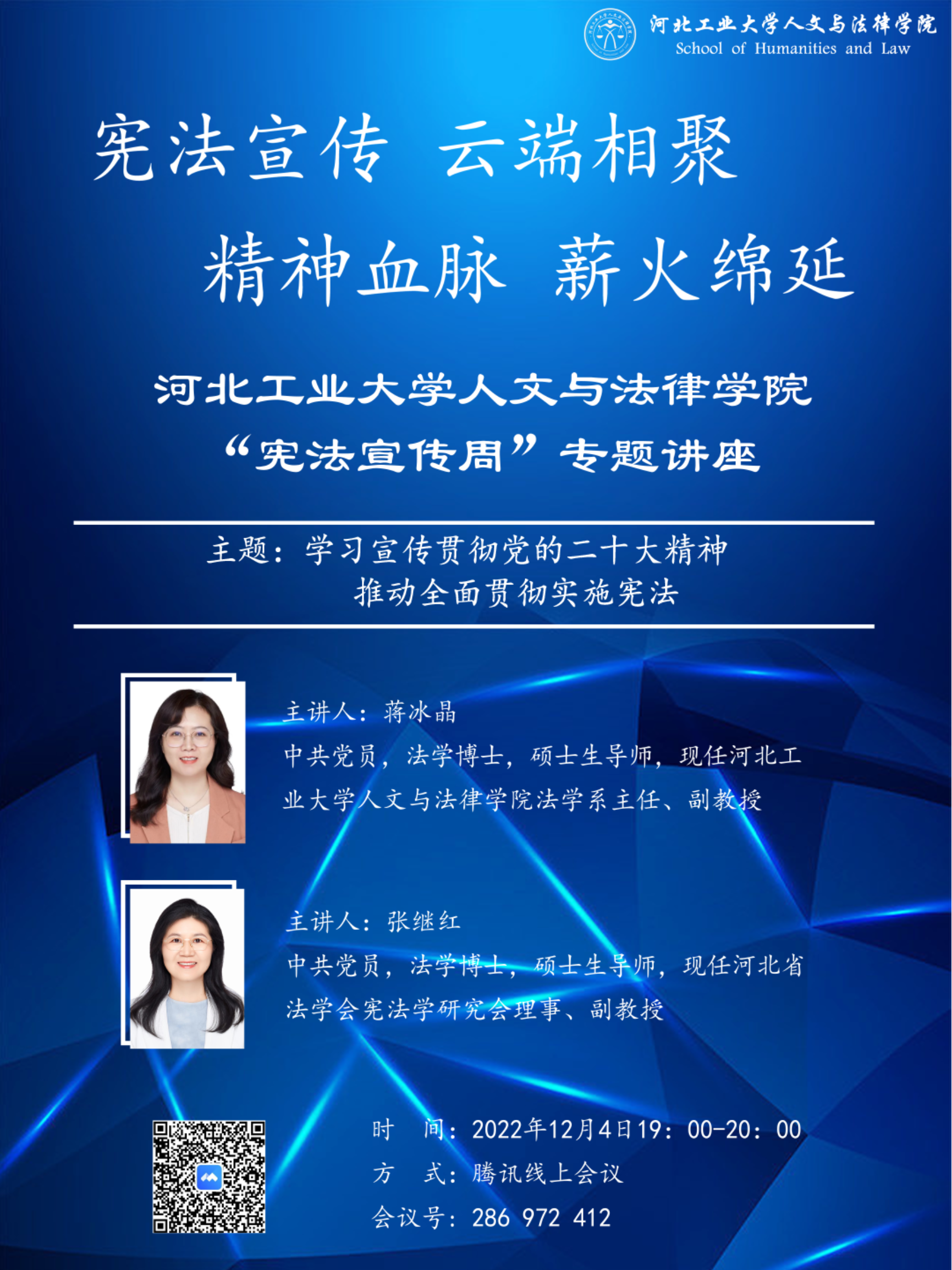 为了让同学们更深入地学习宪法,蜜桃视频 在12月4日晚上7点至8点举办了“宪法宣传,云端相聚,精神血脉,心火绵延”宪法宣传讲座,由蒋冰晶老师和张继红老师担任主讲人。两位老师围绕着学习宣传党的二十大精神、习近平法治思想、关于保障公民权利和规范国家权力的具体事例,以及法治思维、法治思想等内容向参会的同学介绍了关于宪法的知识。
