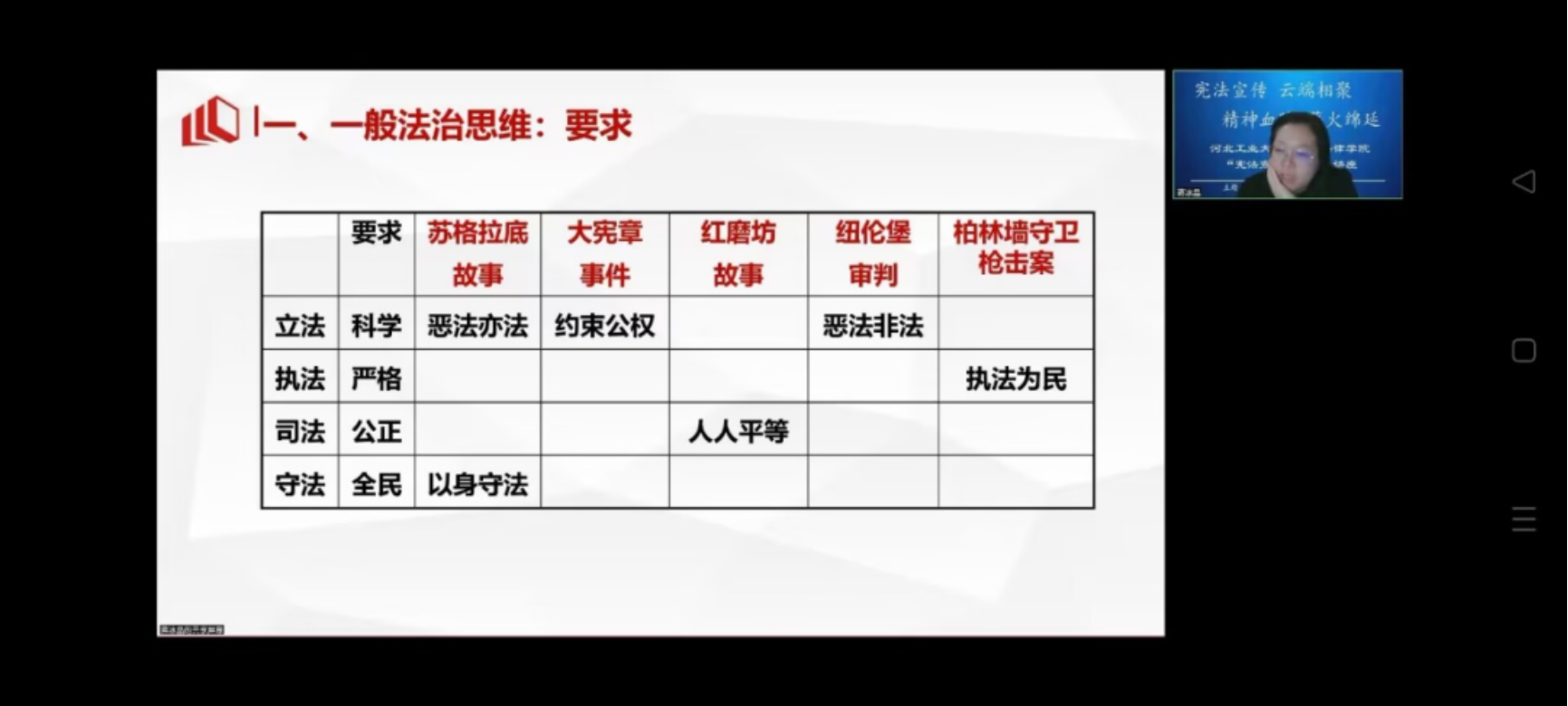 然后是蒋冰晶老师为我们讲解。蒋老师从法治思维入手,讲述了科学立法、严格执法、公正司法、全民守法的要求。接着蒋老师为我们讲述了许多关于法治思维的故事,如苏格拉底的故事中体现的以身守法、大宪章事件中约束公权的内容、红磨坊故事中关于人人平等以及公正司法的内容、纽伦堡审判中关于科学立法方面恶法非法的讲述、柏林墙守卫枪击案中严格执法中执法为民思想的体现……随后蒋老师向我们讲述了一般思维中的要件即规范与规则、证据与事实、程序与公开、良心与道德,这些法律要件成为了系统性法治思维的必不缺少的部分。