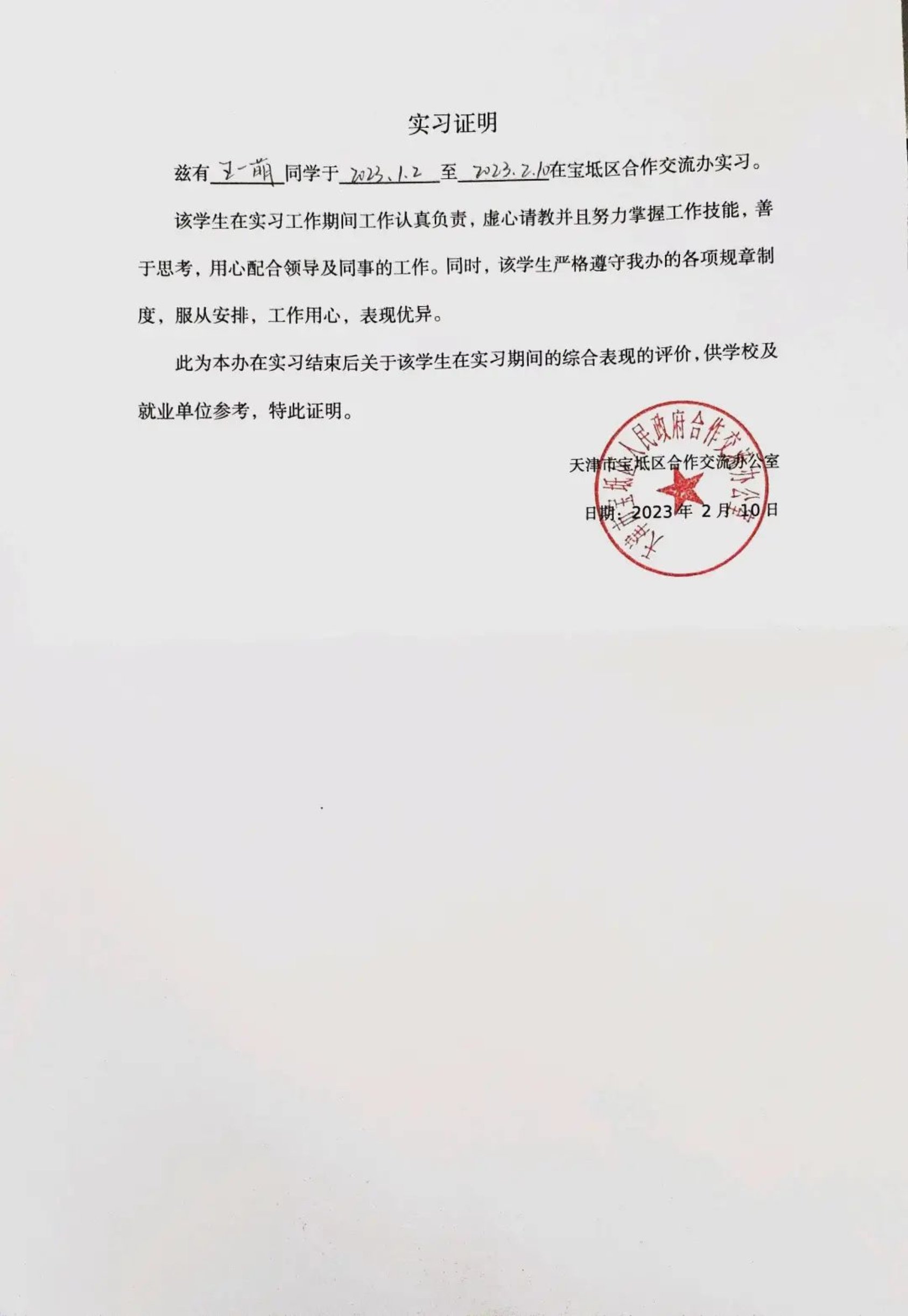 2022年寒假天津市大学生实习“扬帆计划”政务专项工作在各团区委、各高校团委、各用人单位和实习生的共同努力下圆满结束。经过各单位组织申报、考察审核等环节,蜜桃视频 法学204班学生王一萌同学荣获“优秀实习生”称号。