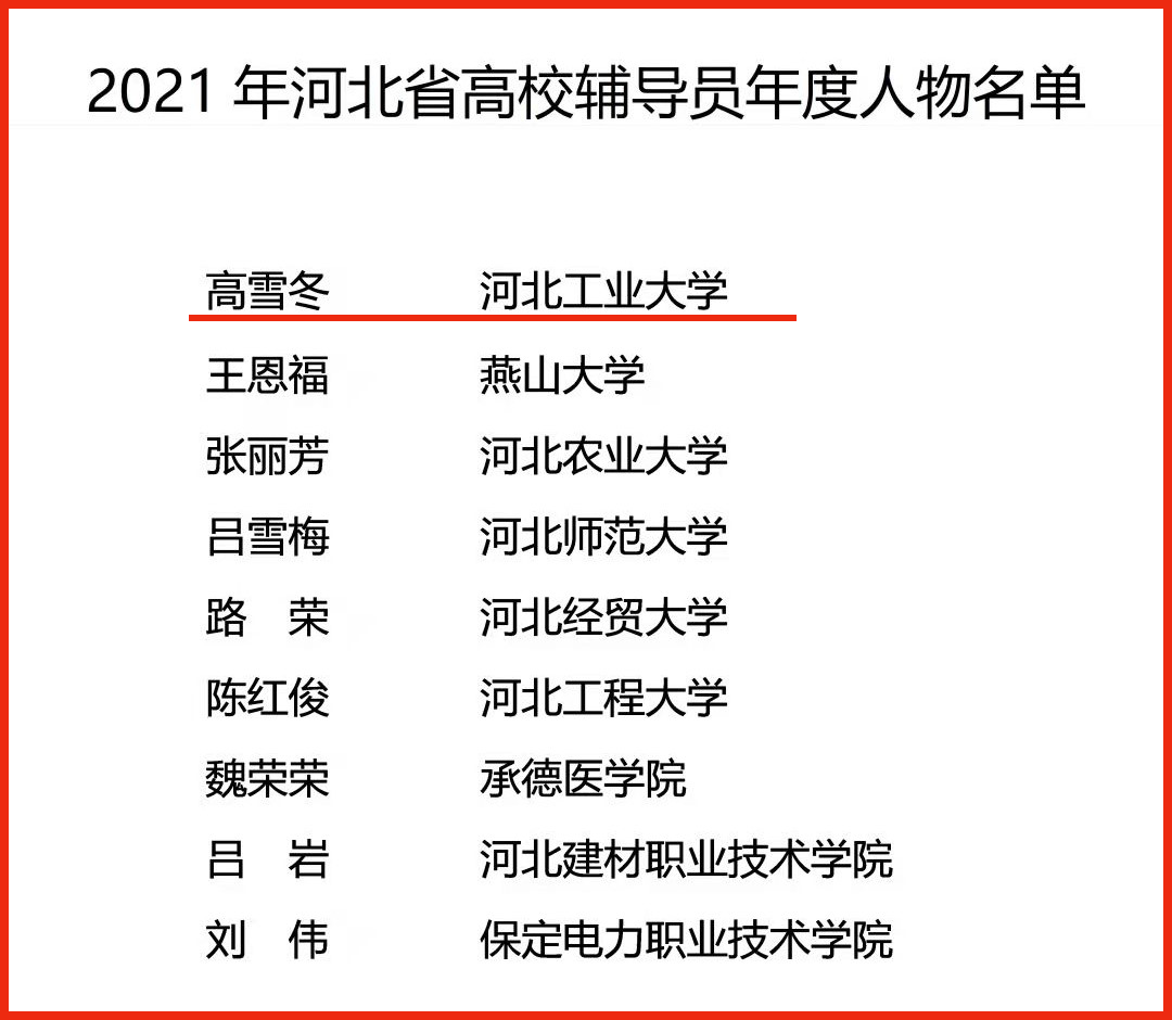 11月1日,我省教育厅公布了2021年河北省高校辅导员年度人物和人物提名名单。我校高雪冬老师荣膺“2021年河北省高校辅导员年度人物”殊荣。
