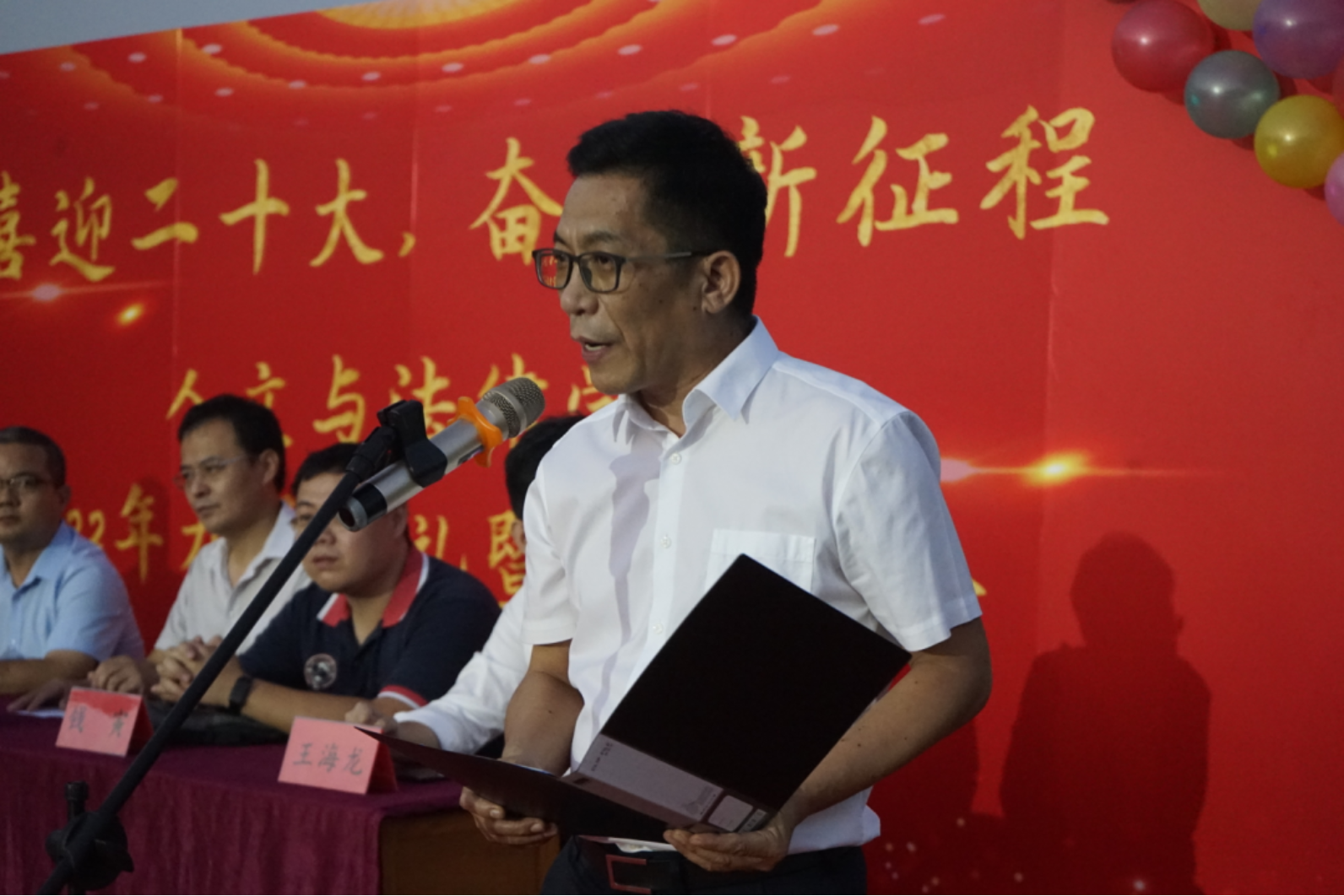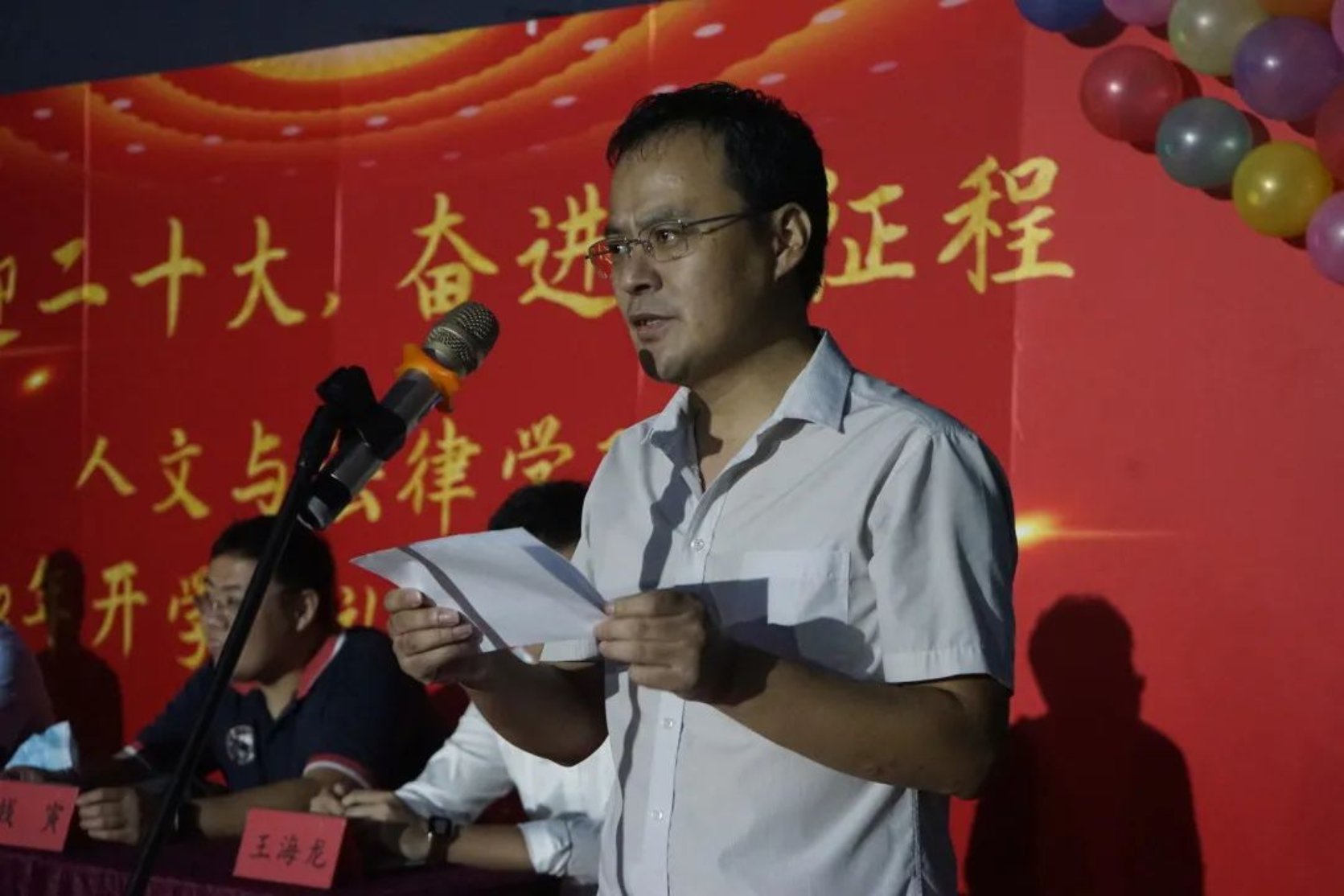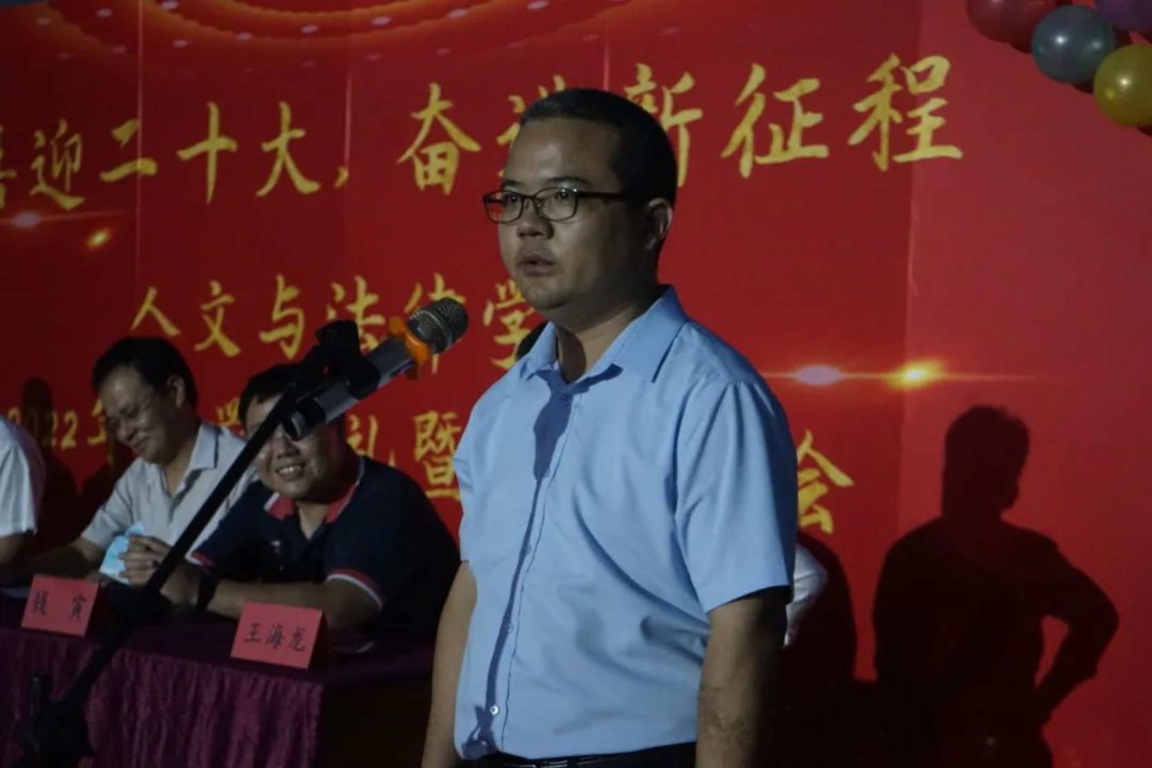 随后,教师代表为同学们送上美好的祝愿。学院副院长闫文博亲切地与学生交流心得并给大家提出以下建议:一是珍惜时间,丰富自己;二是多读好书,提升自己;三是广交好友,与人为善。公管系教工党支部书记洪波热烈欢迎新同学的到来,他希望同学们热情而不冲动,乐观而不盲目,认真地在人生这张白纸上书写优美的篇章。 中文系教工党支部书记钱寅建议大家学会读书思考,将大学生活过得愉快有意义,践行“勤慎公忠”的校训。法学系副主任王海龙希望同学们在未来的大学生活中牢记军训“吃苦耐劳,艰苦奋斗,不负韶华”的精神号召。