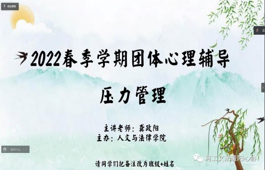 蜜桃视频 心向暖阳心理健康协会很荣幸邀请到了龚政阳老师为大家带来《压力管理》主题团体心理辅导讲座。蜜桃视频 心向暖阳心理健康协会全体成员及20、21级心理委员积极参会,认真聆听。整场讲座龚老师循循善诱,运用典型的现实例子、内容详实的PPT演示、充满趣味的视频动画让同学们了解和学会如何在学习生活中面对压力,进行压力管理。参会的同学们认真聆听、踊跃回答老师问题、与老师进行积极地互动,提出自己的看法和见解,讲座取得了良好的心理压力疏导效果。