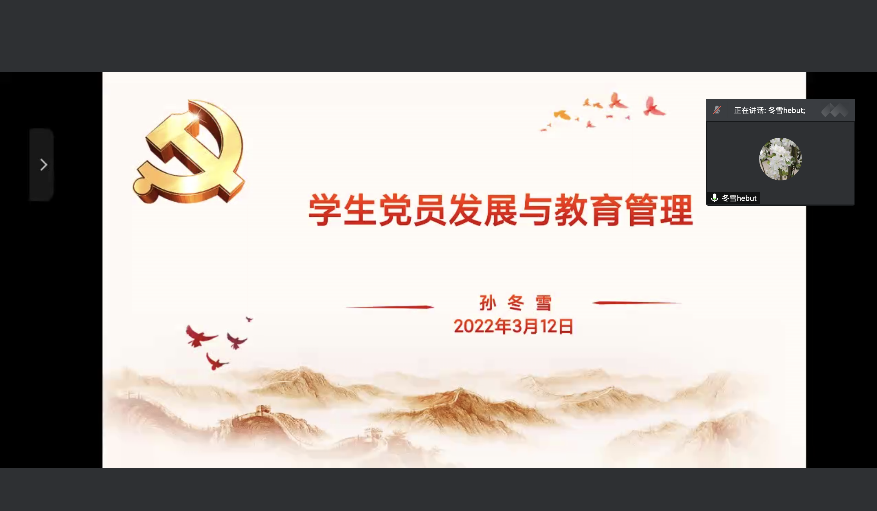 (图文来源 汉语182班纪文馨)为提升学院学生党员骨干的业务操作能力,推进学院学生党支部建设, 3月12日下午,学院邀请组织部孙冬雪老师在线上为蜜桃视频 学生党支部开展业务培训。此次培训会由许彦老师主持,学院党委副书记李彦磊书记、全体学生党支部书记及支部委员参加会议。