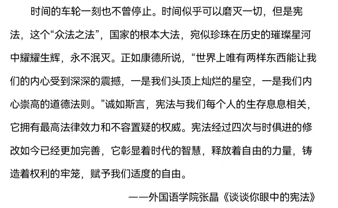 学校的相关组织还举行了“宪法走近你我”征文活动和“我与宪法”微视频征集活动。活动聚焦于学生对宪法学习的感悟、对宪法与生活联系的认识,增进了学生与宪法之间的联系与认同感。