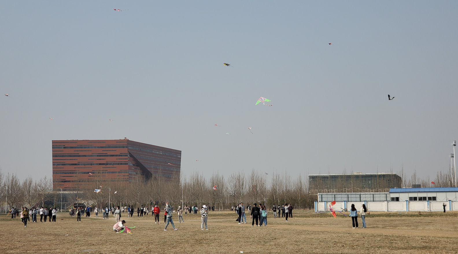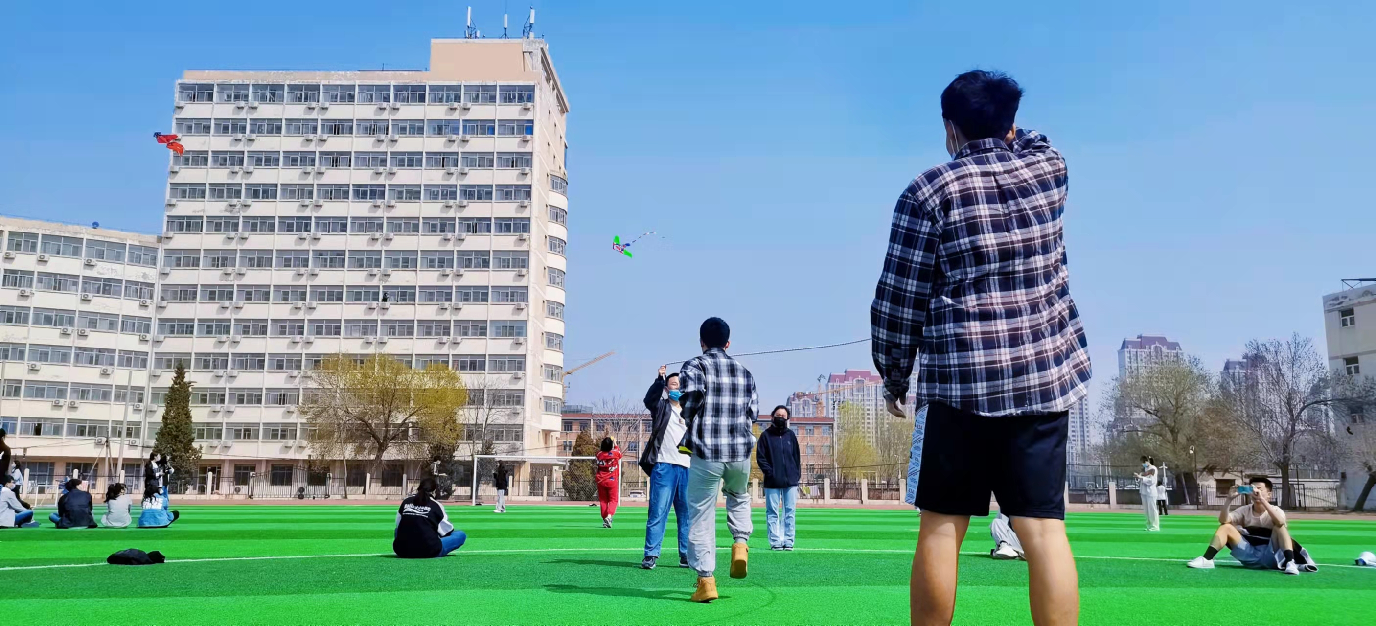 同学们“精诚合作”,轮流放飞,风筝同春风一齐飘扬,快乐同自由一同荡漾,碧绿色的操场映衬着蓝天上的白云朵朵,草木之间如有群鸟过境,似有“忙趁东风放纸鸢”的诗意。