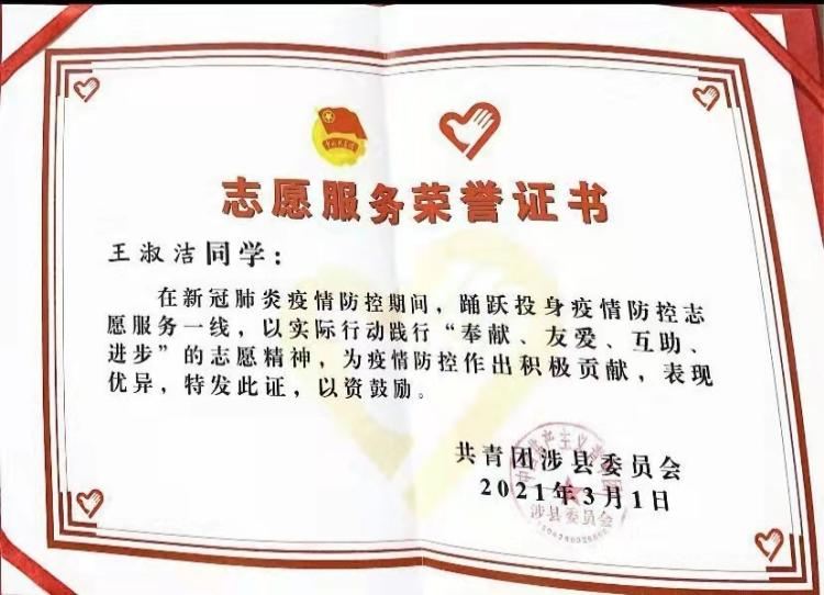 汉语181班王淑洁同学,于2021年1月到2月,积极主动地参加邯郸市涉县疫情防控志愿服务活动,荣获志愿服务荣誉证书。
