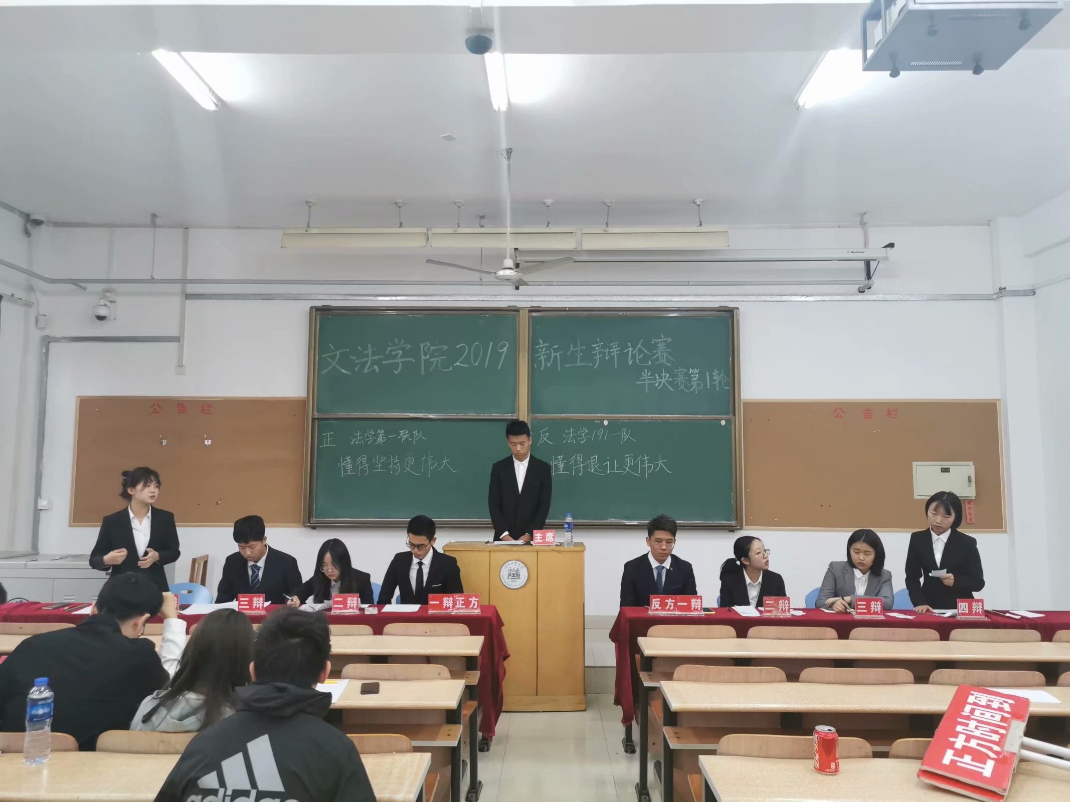 正方首先阐明了自己的观点,认为“正义取决于其本身而非手段”,以暴制暴可以称之为正义;面对正方的犀利言辞,反方一针见血地指出:“初衷正义并不代表行为正义,以牙还牙不符合人道主义精神。”正方步步紧逼,反方泰然自若、沉着应战。最终正方夺得桂冠。