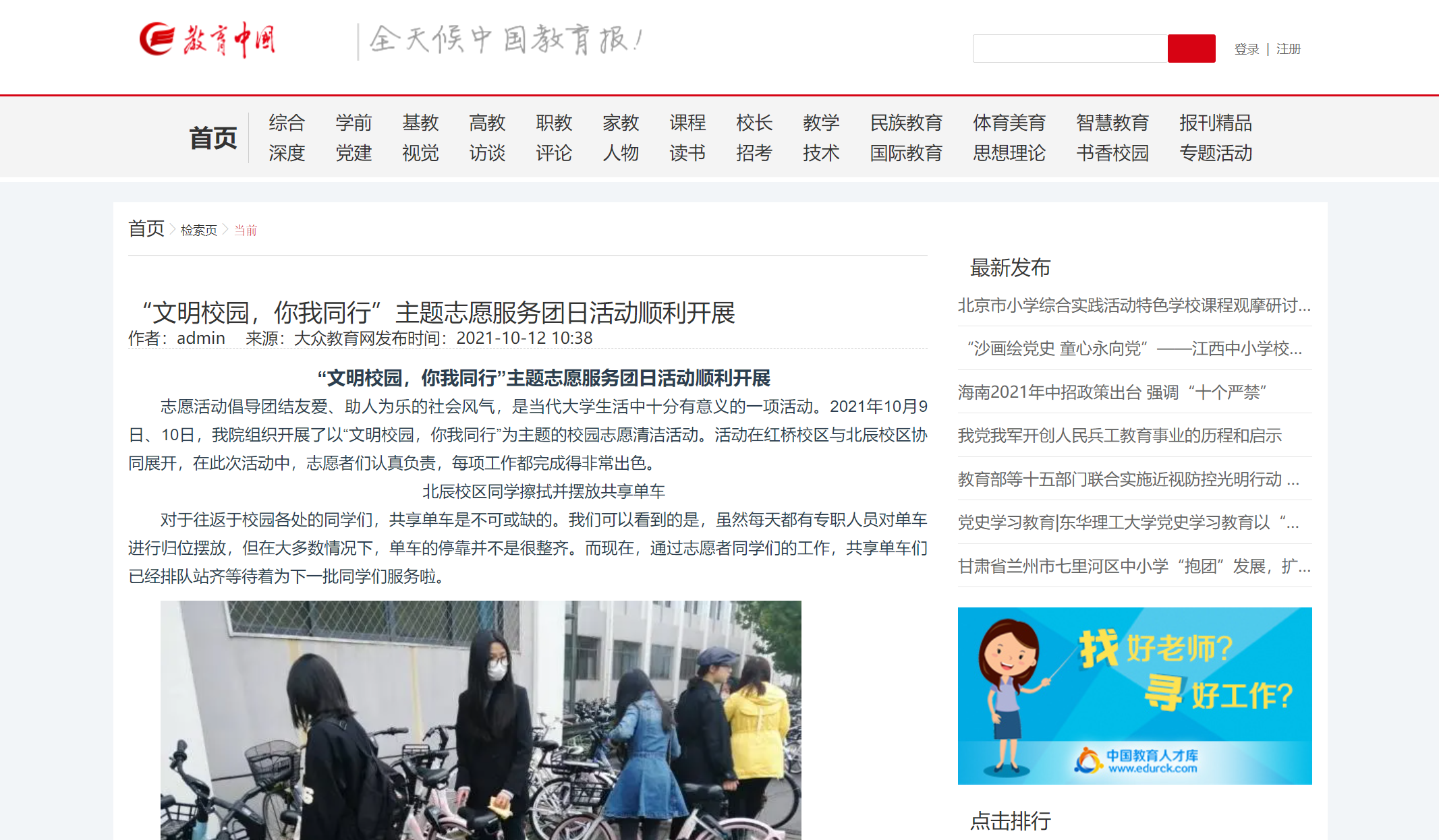 志愿活动倡导团结友爱、助人为乐的社会风气,是当代大学生活中十分有意义的一项活动。2021年10月9日、10日,蜜桃视频 组织开展了以“文明校园,你我同行”为主题的校园志愿清洁活动。活动在红桥校区与北辰校区协同展开,在此次活动中,志愿者们认真负责,每项工作都完成得非常出色。