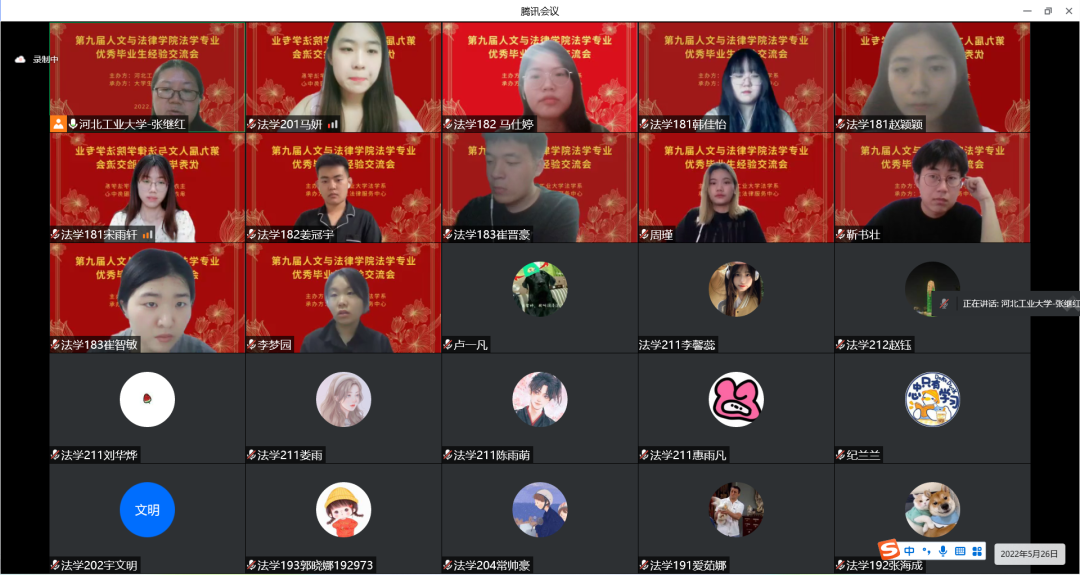 5月26日下午7点,第九届蜜桃视频 法学系优秀毕业生经验交流会顺利举办。本次经验交流会由蜜桃视频 法学系主办,法律服务中心承办,通过线上直播的方式进行。参与交流的有12位来自2017、2018级优秀的学长学姐,法学系的张继红老师担任本次交流会的指导老师。