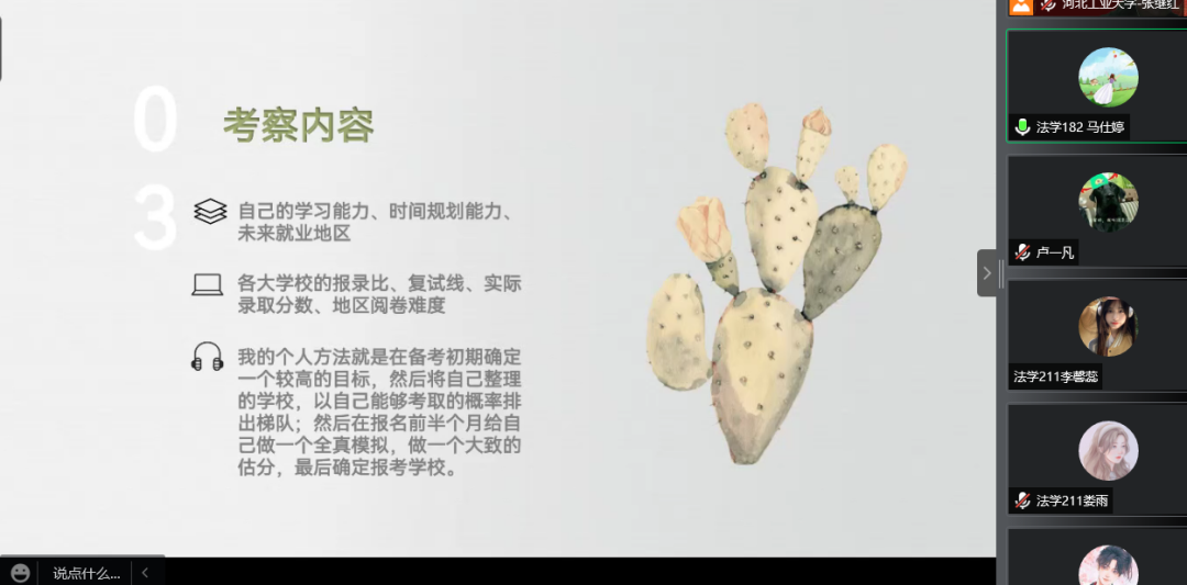 成功考研到中南财经政法大学、西北政法大学、南开大学、对外经贸大学、西南政法大学的学姐学长向大家分享了他们考研历程中的经验,帮助同学们了解择校方法、考研准备的时间以及复习的正确方法等。