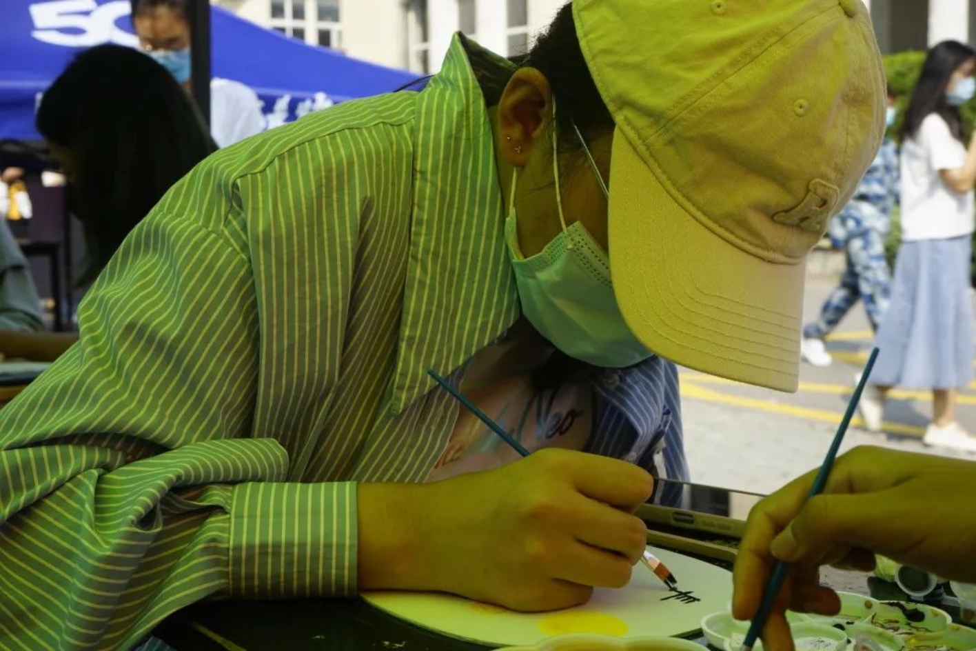 在活动过程中,同学们自己构思设计,用工具在扇面上进行绘画。学生们既秉持传统,又张扬个性,在短短的时间内,创作出一把把风格迥异的团扇,有的扇面展现着古典的清新淡雅,有的扇面展现着现代的绚丽多彩……一把把象征团圆与思念的美丽团扇就这样在学生手中诞生了,艺术之花在扇面上竞相绽放,素面团扇上绘出学生们心中的中秋诗意之美。
