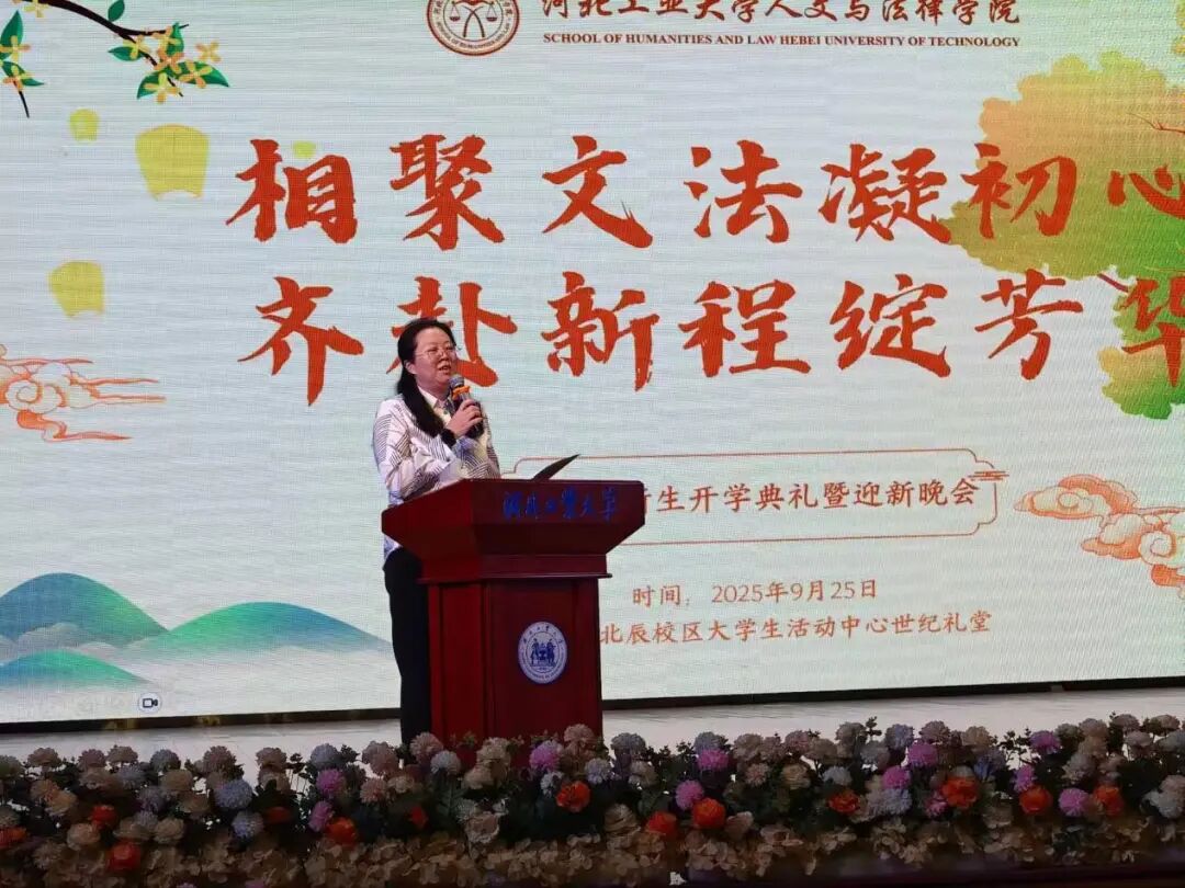 典礼伊始,蜜桃视频 院长蒋冰晶作迎新致辞,向加入文法学院的新同学们表示热烈欢迎,并围绕四点期望展开寄语:一是胸怀家国天下,将个人理想融入时代脉搏,以青春力量服务社会发展;二是永葆好奇心与求知欲,既要在课堂上与老师碰撞出思想的火花,又要在社团活动中绽放自我的光彩,“纸上得来终觉浅,绝知此事要躬行”,蒋院长以此勉励同学们要在实践中探索真知、锤炼品格;三是常怀感恩之心,铭记父母的养育之恩和老师的谆谆教诲,珍惜同窗之谊,不负韶华时光;四是涵养乐观豁达的胸襟,以从容之态应对挑战,于磨砺中凝聚奋进之力。最后,蒋院长衷心祝愿文法学院的同学们能够秉承“勤慎公忠”的校训,在人文底蕴与法治精神的滋养下,成长为有温度、有筋骨、有担当的时代新人,在河北工大的热土上放飞青春梦想!