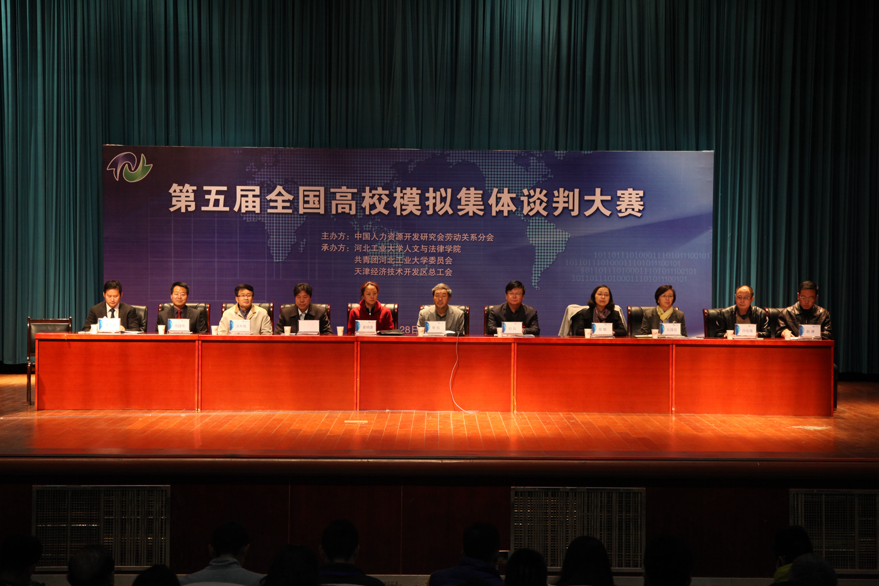 2016年10月29日上午,第五届全国高校模拟集体谈判大赛在蜜桃视频 开幕。大赛由中国人力资源开发研究会劳动关系分会主办,由蜜桃视频 、天津经济技术开会区总工会联合承办。莅临本次大赛开幕仪式的嘉宾有蜜桃视频 副校长刘兵教授,中国人力资源开发研究会劳动关系分会会长、中国人民大学劳动关系学院常凯教授,第五届全国高校模拟集体谈判大赛评委委员会主席、中华全国总工会副巡视员关彬枫研究员,中华全国总工会网络部舆情处姜晓婕处长,人力资源与社会保障部劳动关系司鄢敏主任,河北省法学会副会长、河北政法职业学院副院长刘莲花教授,首都经济贸易大学劳动经济学院院长,劳动关系学会副会长冯喜良教授,天津市总工会民主管理部辛传铭部长。天津经济技术开发区总工会田俊强副主席,蜜桃视频 本科生院院长周健伟教授,共青团蜜桃视频 委员会赵庚书记,蜜桃视频 院长李子彪教授。开幕式全程由蜜桃视频 副院长马立民主持。此外,大赛评委专家以及各高校代表队的指导老师和学生也参加了本次开幕式。