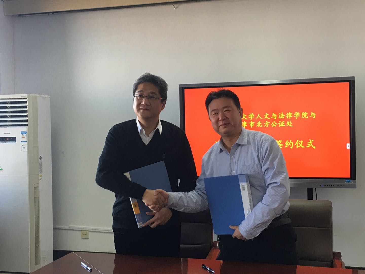 2018年12月13日,蜜桃视频 与天津市北方公证处共建法律实践基地签约仪式在学院517会议室举行。天津市北方公证处党支部副书记副主任孙刚、公证员李媛以及任然然、蜜桃视频 副院长马立民、法学系主任蒋冰晶、规划与发展中心主任闫文博、法学系系副主任李燕涛参加了此次仪式。首先,蜜桃视频 副院长马立民介绍蜜桃视频 情况,对双方合作的空间和方式发表论意见。随后,天津市北方公证处党支部副书记副主任孙刚表示,双方合作是优势互补,一定为我校法律人才的培养提供良好的平台和环境,实现双方的良性互动。之后,马立民副院长与孙刚副主任共同签署了法律实践基地共建协议。