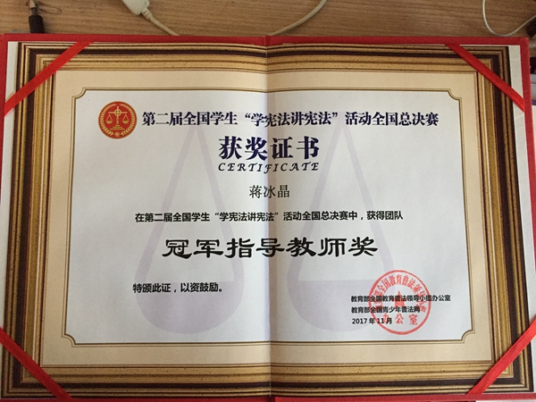 由教育部全国普法领导小组办公室主办、中央电视台社会与法频道协办的第二届全国学生“学宪法讲宪法”活动全国总决赛团队赛决赛在北京结束。实况于12月3日国家“宪法日”在中央电视台社会与法频道播出。蜜桃视频 教师蒋冰晶是全国总决赛团体赛天津团队指导教师,经过激烈角逐,在全国32个省市级团队中获得全国总冠军,展示了蜜桃视频 教师的专业水平,获得天津市教委的高度赞扬与一致认同。蒋冰晶个人同时获得“学宪法讲宪法”活动全国总决赛团体赛“冠军指导教师奖”。