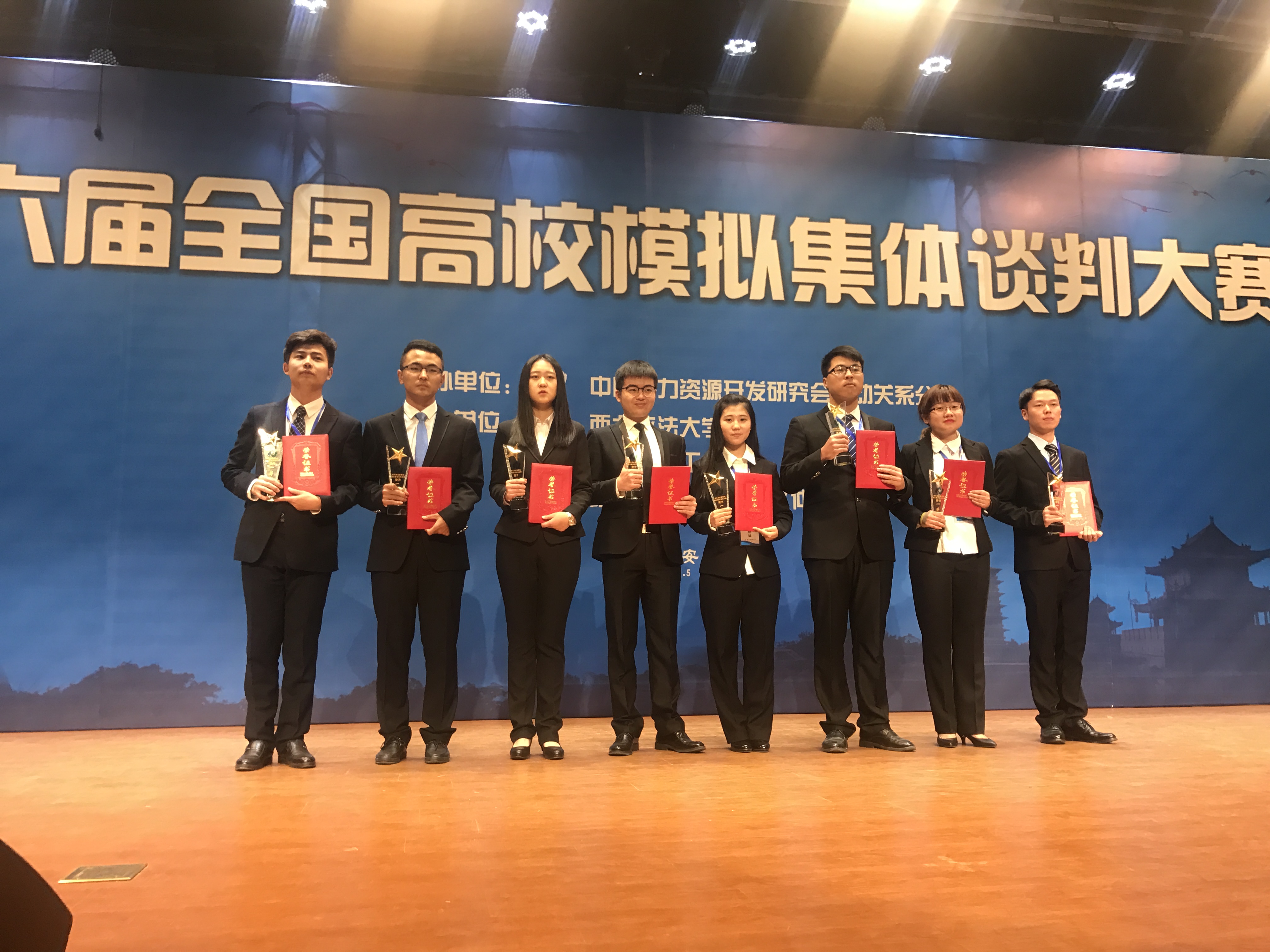 暮秋已至,寒意渐浓。2017年11月4至6日,第六届全国高校模拟集体谈判大赛在西北政法大学举行,大赛由中国人力资源开发研究会劳动关系分会主办,目前已在北京、山东、浙江、天津等地连续举办六届。本次大赛共有 33 所高校参与,共计有 66 支代表队伍,参赛师生人数达 400 多人。我校蜜桃视频 经过两个多月的精心准备,通过层层筛选,选拔出法学专业,劳动与社会保障专业共10名学生组成劳方队和资方队两支代表队,参加此次比赛。经过初赛激烈的筛选,我校劳方队一路披荆斩棘,站在了决赛的赛场上。在决赛中,双方谈判就一线员工工资涨幅、企业员工的福利以及增设工龄工资等运用了多种谈判技巧,以退为进,以守为攻,先发制人,为在场的评委和同学上演了一场精彩的视听盛宴。最终,劳方与资方都达成了共识,并签订了集体劳动合同。评委老师对本场参赛的同学们进行了精彩的点评。