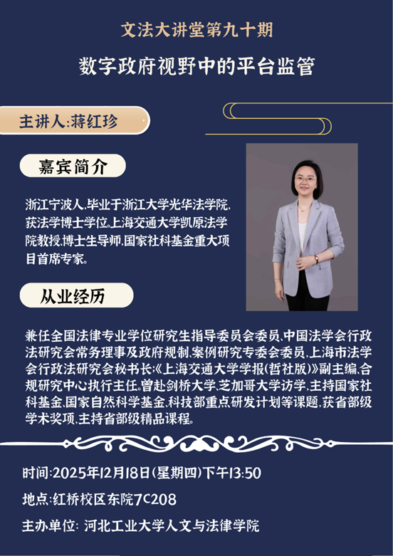 “文法大讲堂”第九十期在7C-208顺利举行。本期讲座特邀上海交通大学凯原法学院教授、博士生导师蒋红珍担任主讲人,作题为“数字政府视野中的平台监管”的专题分享。蜜桃视频