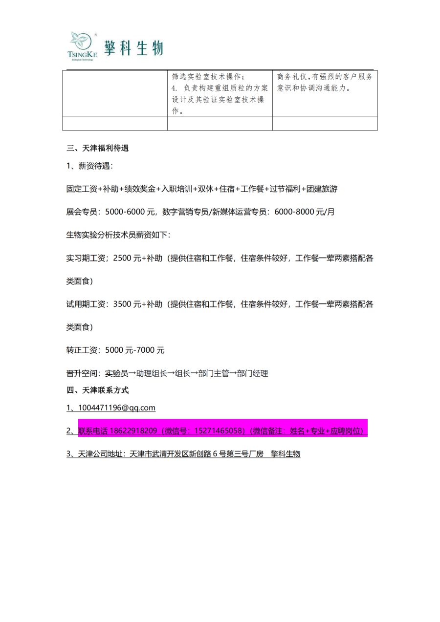 天津擎科生物技术有限公司招聘简章